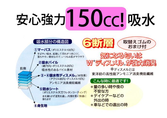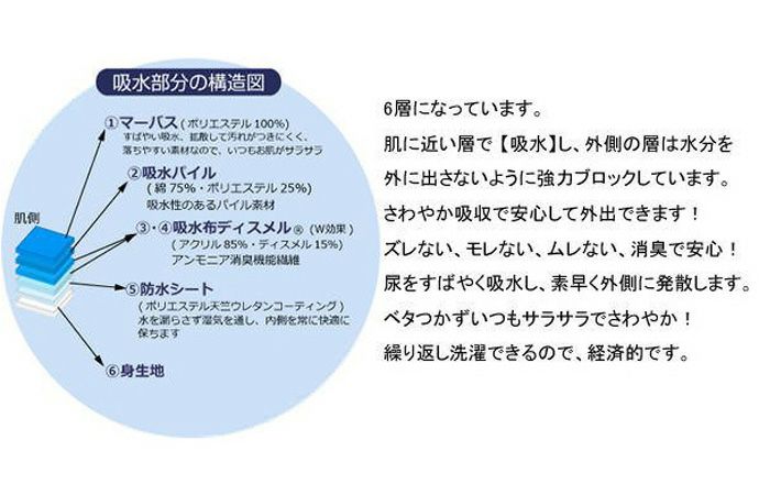 尿取りパッドや紙おむつの着用時にズレたり、はずれたりというような心配がなく、フィット感に優れていて、履いていて違和感がなく、快適に過ごせる事が特徴です。