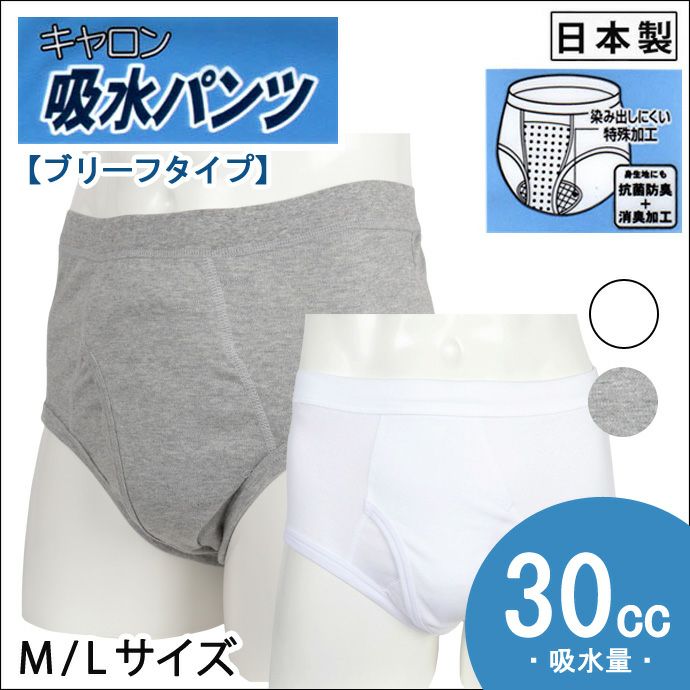 spm00063 【キャロン】吸水パンツ【ブリーフタイプ】【30cc】【M/L】ホワイト・グレー杢/綿100%/日本製/尿漏れパンツ失禁男性用【メール便対応/1枚まで】