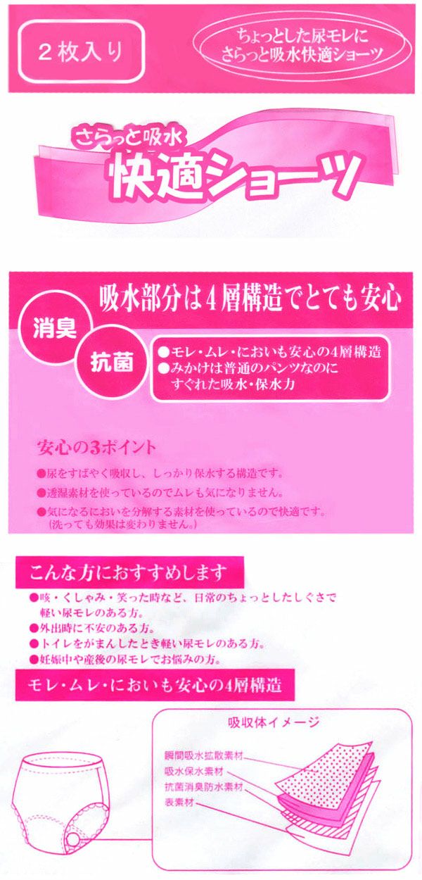 他の画像を見る sho00095 【美和商事】【2枚組】さらっと吸水快適ショーツ【パッド部30cc】【M/L/LL】綿100%/尿漏れショーツ失禁女性用 定価 ¥ 1,696 のところ 当店特別価格 ¥ 1,280 税込 在庫切れ カートに入れる お気に入りに登録する