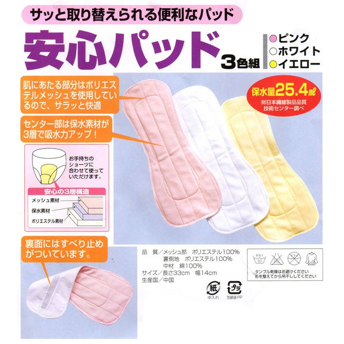 他の画像を見る shp0001 【セルヴァン】【3色組】安心パッド【吸水パッド】【25.4cc】【長さ33cm・幅14cm】イエロー・ホワイト・ピンク/尿漏れパッド 当店特別価格 ¥ 1,760 税込 在庫切れ 詳細を見る お気に入りに登録する