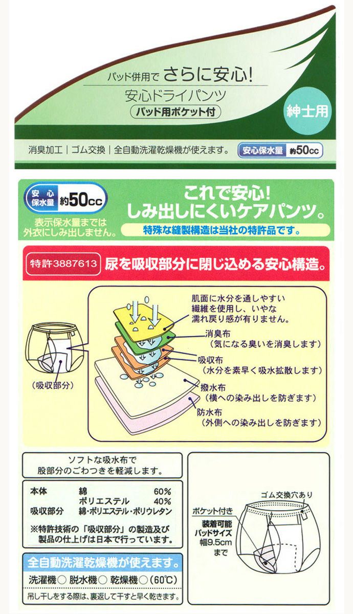 他の画像を見る spm00089 【日本エンゼル】【3196】不安解消カジュアルパンツ【トランクスタイプ/前開きタイプ】【25cc】【M/L】赤・青・緑/綿100%/日本製/尿漏れパンツ失禁男性用【メール便対応/1枚まで】 当店特別価格 ¥ 3,960 税込 カートに入れる お気に入りに登録する