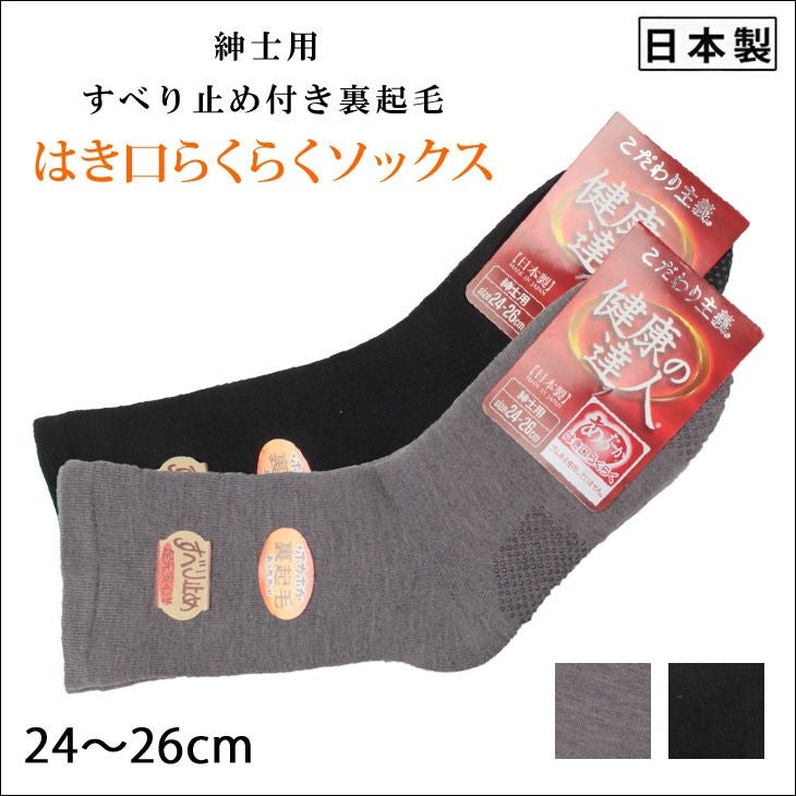 【先丸】紳士用【すべり止め付き裏起毛】健康の達人・はき口らくらくソックス【24~26cm】黒・グレー/日本製【メール便対応/2足まで】