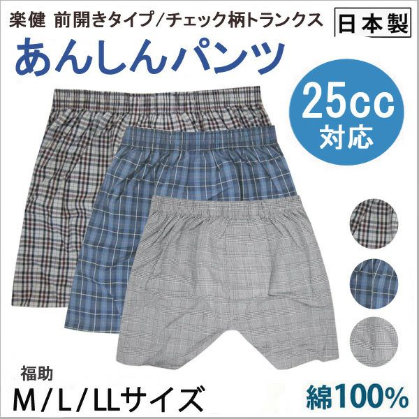 spm00038 【福助・楽健】あんしんパンツ【前開きタイプ/チェック柄トランクス】【25cc】【M/L/LL】尿漏れパンツ失禁男性用