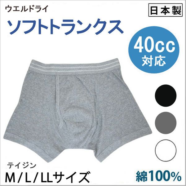 spm00085 【テイジン】ウエルドライ【ソフトトランクス】【40cc】【M/L/LB】ホワイト・杢グレー・ブラック/綿100%/日本製/尿漏れパンツ失禁男性用